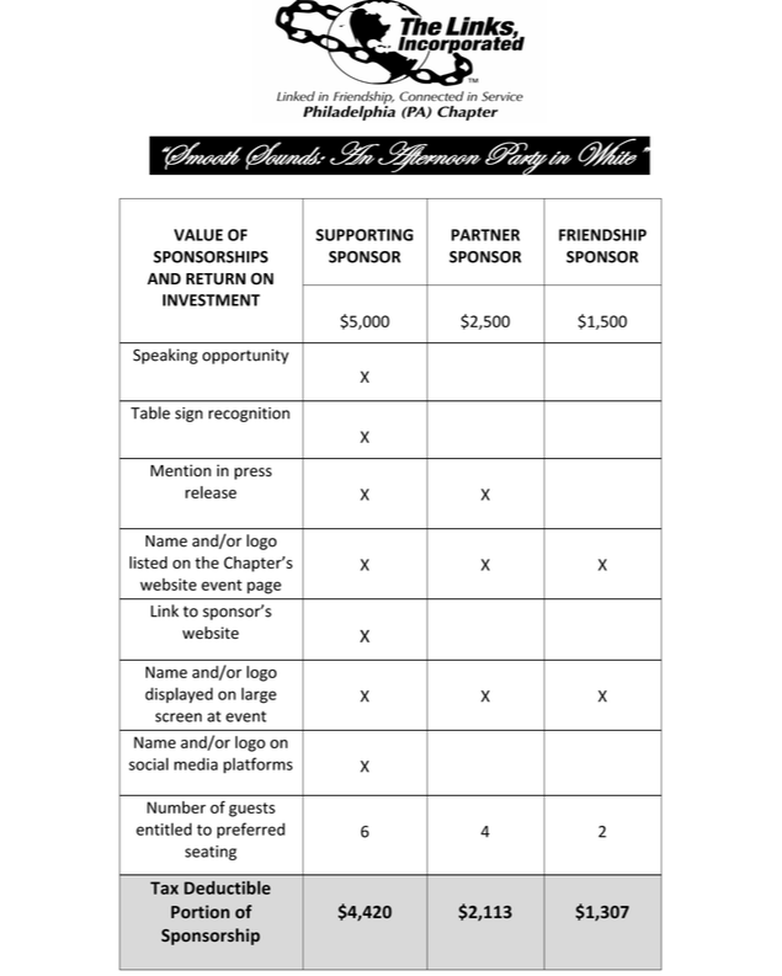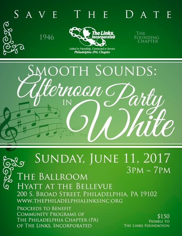 On behalf of The Philadelphia Chapter of The Links, Incorporated, we are seeking your support of our June 11, 2017 fundraiser, "Smooth Sounds: An Afternoon Party in White".The Links, Incorporated is an international, not-for-profit corporation, established in 1946. Its membership consists of nearly 14,000 professional women of color in 283 chapters in 41 states, the District of Columbia and the Commonwealth of the Bahamas. It is one of the nation's oldest and largest volunteer service organizations of extraordinary women who are committed to enriching, sustaining and ensuring the culture and economic survival of African Americans and other persons of African ancestry.In 2016, The Philadelphia Chapter performed more than 3,000 hours of community service, including our signature "Educate a Girl, Educate a World" mentorship program for girls at Paul Robeson High School for Human Services. The Philadelphia Chapter also funds college scholarships and collaborates with other service organizations on projects that favorably impact communities.Below is information about our fundraiser event and a list of sponsorship opportunities. Your support as a sponsor will help us continue to make a positive difference in our community.Thank you for your consideration,Dr. Mahlene Duckett Lee, President